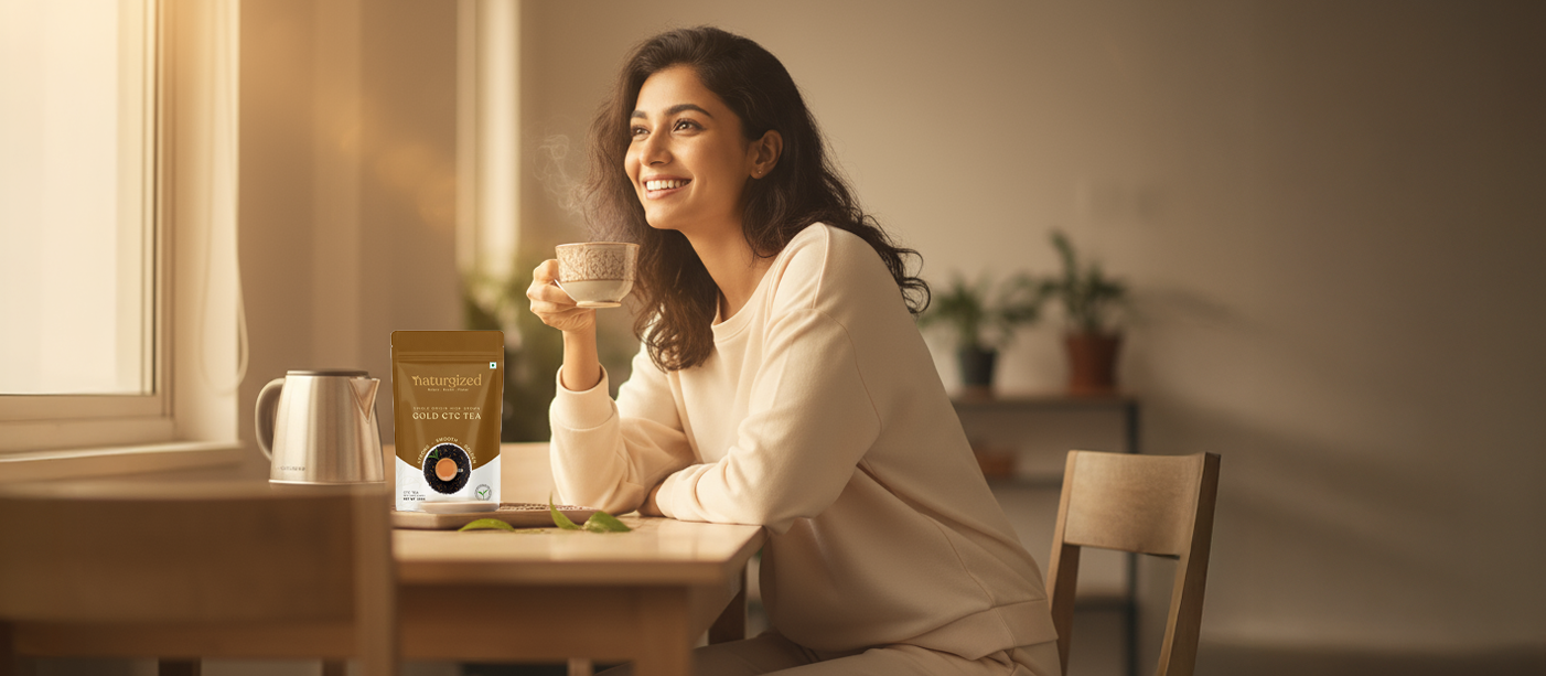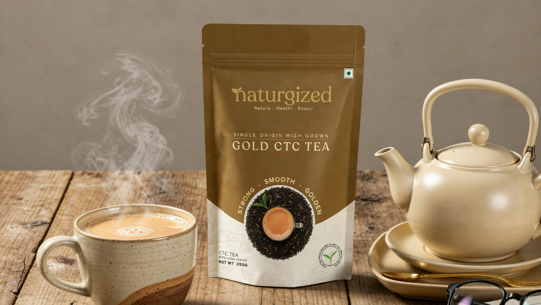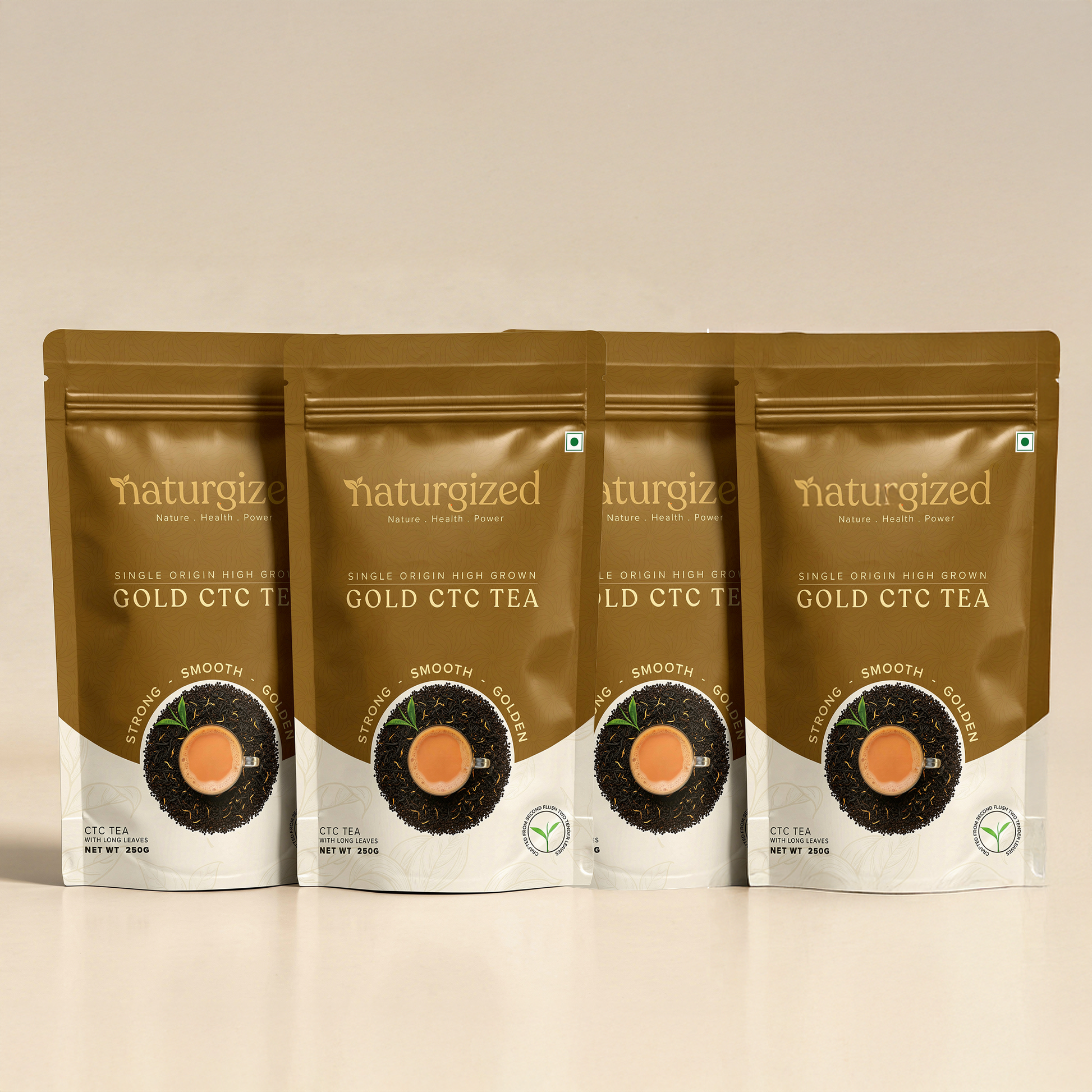 Naturgized Gold CTC Tea is crafted for those who love a strong yet refined cup, rich in character and depth. It’s ideal for early risers who want a powerful start with a smoother edge, busy professionals seeking a refreshing yet balanced break, and families who appreciate the comfort of a premium Indian chai. Blended with select orthodox long leaves and robust CTC, it can be enjoyed plain or with milk and spices - perfect for anyone who values strength, warmth, and tradition with an elevated touch in every cup.